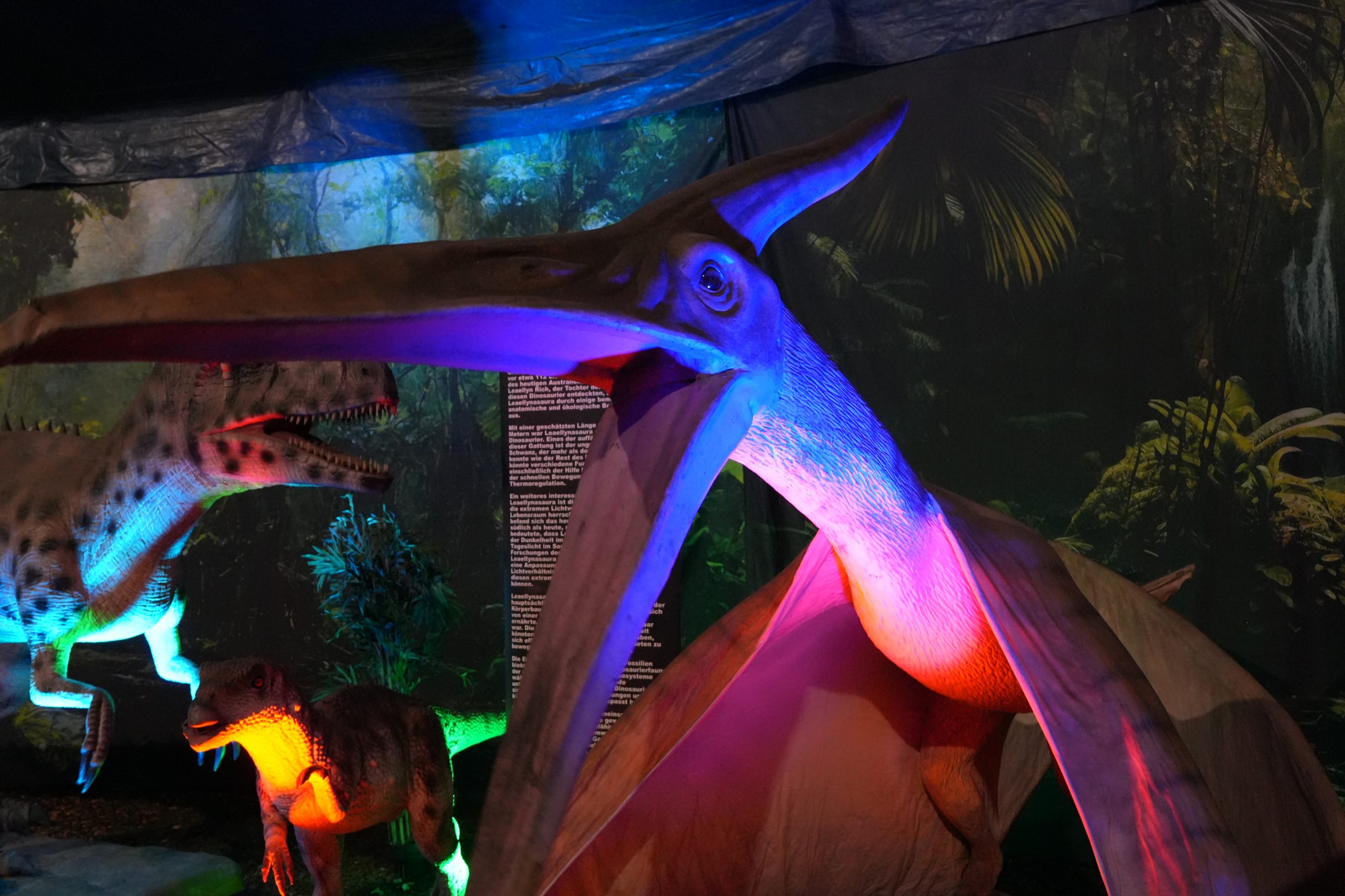Schon beim Betreten der Ausstellung wird klar: Hier geht es nicht um laute Effekte oder schnelle Reize. Die Kulissen sind groß, dunkel gehalten und bewusst ruhig inszeniert. Man läuft durch eine Welt, die an eine Zeit erinnert, in der der Mensch noch keine Rolle spielte. Massive Landschaften, gedämpftes Licht und eine Atmosphäre, die eher zum Beobachten als zum Durchrennen einlädt.